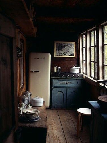 (the closer I look at the image the more it looks like a miniature, but anyways) A cozy cabin in the woods. Gas stove. Tea with milk in tin cups and canned dinners fried up in the pan with butter. A safe haven for a while. A safe haven from the monsters in the woods.